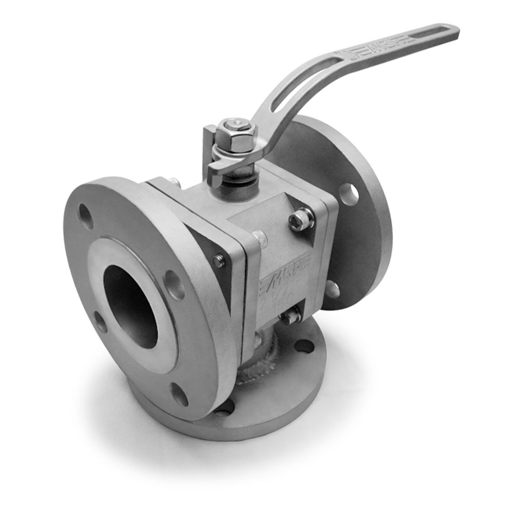 Válvula direcional de fluxo Classe 150, disposta de uma entrada inferior e duas saídas utilizadas para desviar alternadamente o fluxo.